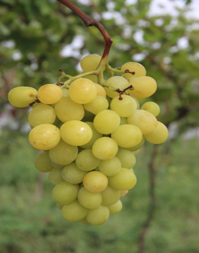 品种特征:平均单穗重500克,最大单穗重1000克,外形美观,成熟期与巨峰相近。果粒重10-12克,绿黄色,座果好,栽培容易,肉质硬脆,有玫瑰香味,可溶性固形物含量20%左右,鲜食品质极优。不裂果,耐贮运,没有落粒现象,果面易产生果锈,抗病性好、可短梢修剪。